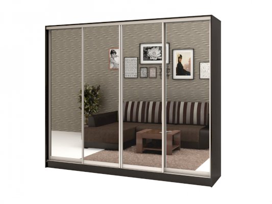 Данное изображение представлено в следующих цветах: корпус - Венге Цаво, фасады - зеркало, рамка двери и треки - Серебро матовое.
