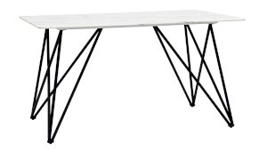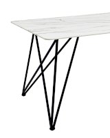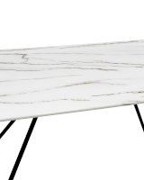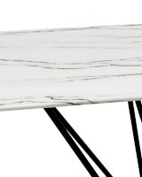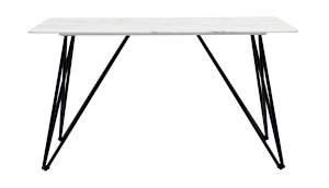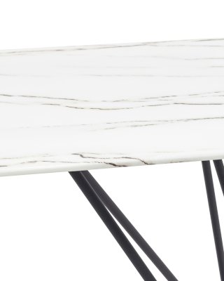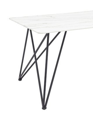 Обеденный стол с красивой стеклянной столешницей белого цвета с рисунком под мрамор. Красивая столешница гармонирует с металлическими ножками оригинальной формы. Такое сочетание смотрится эффектно в любом интерьере.