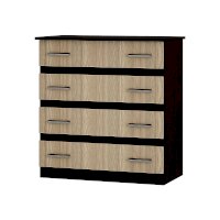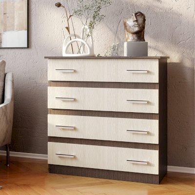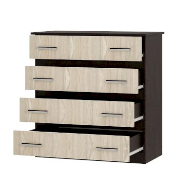 Классическая модель комода Стандарт №6 выполнена из ЛДСП высокого качества. В корпусе используется цвет венге, а фасады выполнены в цвете лоредо. Комод состоит из четырех выдвижных ящиков, на каждом из которых расположены две ручки. Модель Стандарт №6 выделяется увеличенной столешницей, выходящей за границы корпуса.