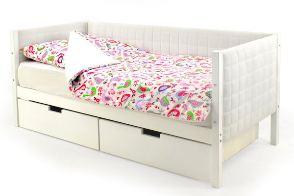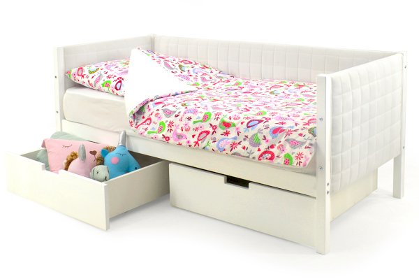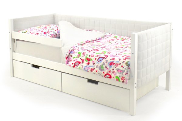 Комплект кровати состоит из каркаса кровати, мягких чехлов на бортики и ортопедического основания. Дополнительный бортик, ящики, матрас и постельные принадлежности приобретаются отдельно.
