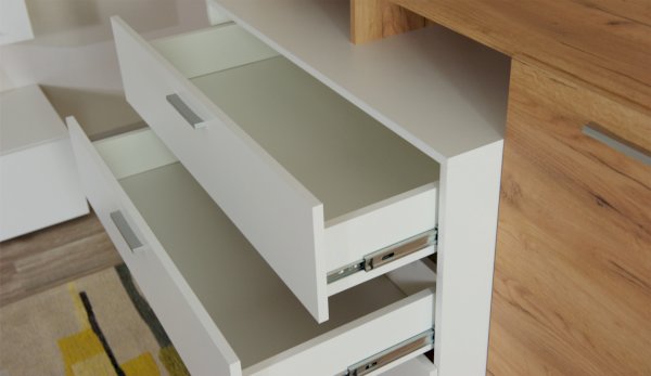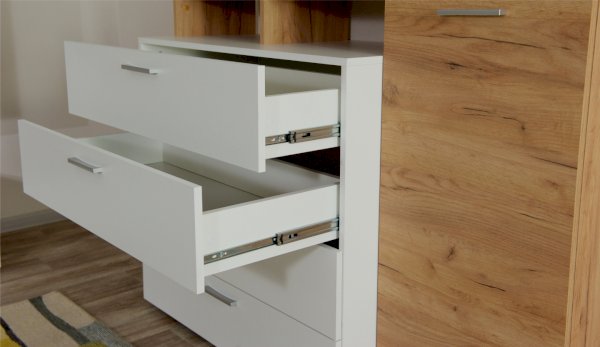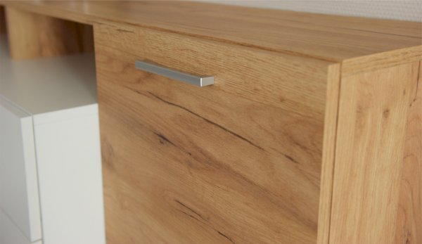 Стенка выполнена с учетом новейших дизайнерских решений - сочетание теплого оттенка дерева с четкой древесной текстурой и белого цвета, разноуровневые модули, скрытая крепежная фурнитура. Все эти элементы создают визуальную легкость и компактность стенки. Мебель легко устанавливается и регулируется по высоте. Широкая тумба для ТВ позволит разместить телевизор любой диагонали, полки послужат для размещения других медиа устройств. Стенку дополняет вместительный комод с ящиками полного выдвижения. Мебель выполнена из высококачественных экологичных материалов.