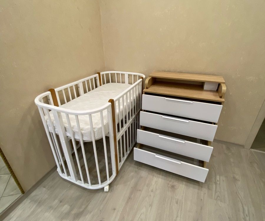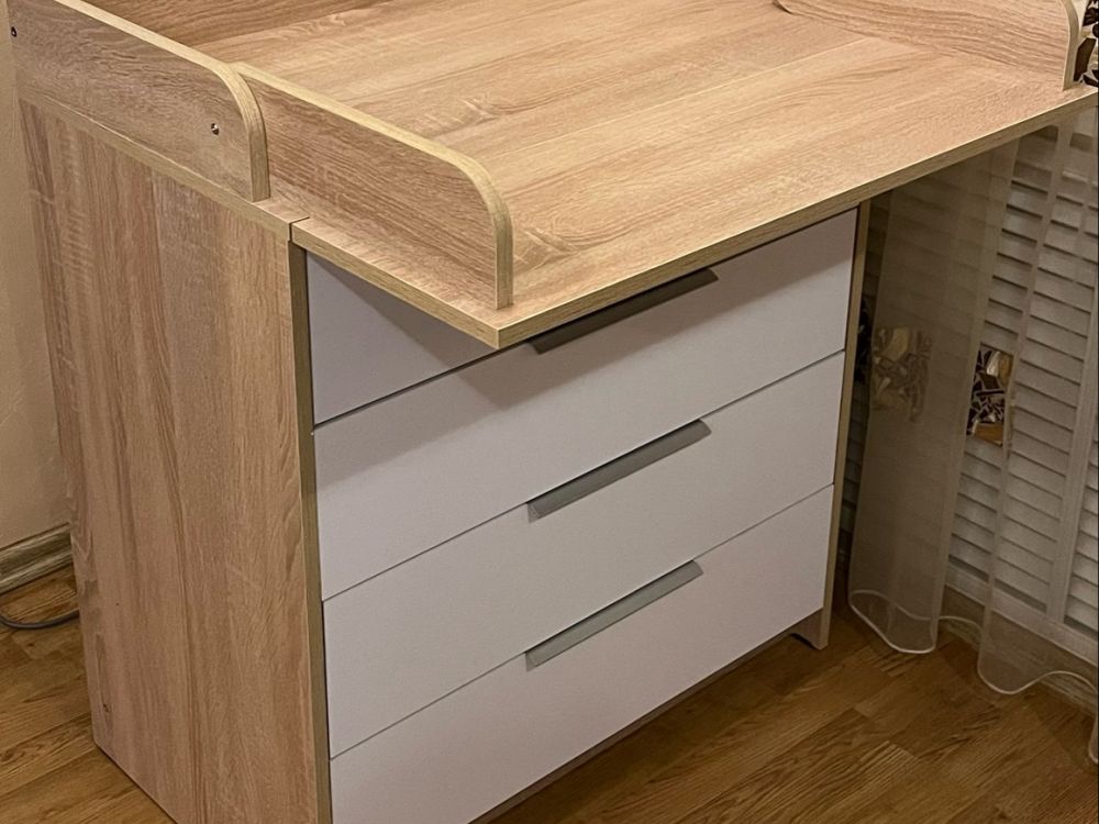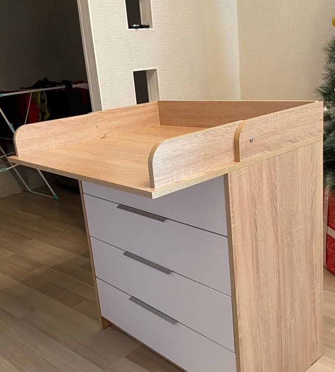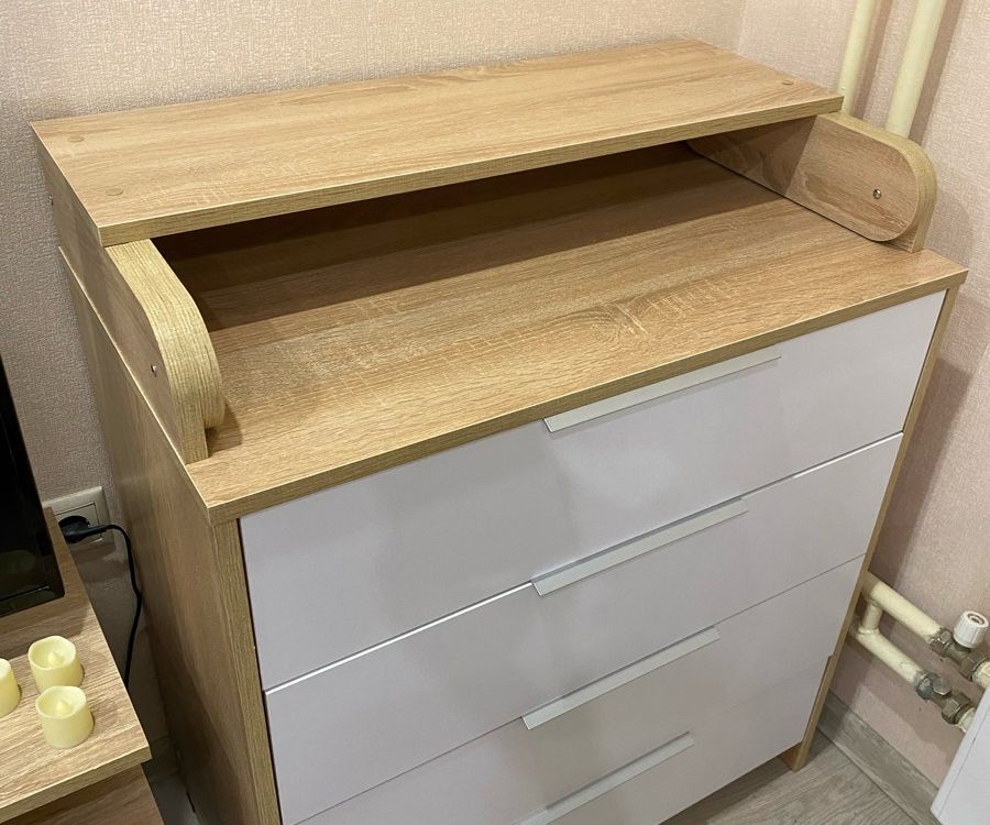 - внешний вид. Цвет дерева полностью вписался в интерьер. Понравились ручки на ящиках; - большой пеленальный столик. Он довольно широкий, механизм вроде крепкий. В крышке комода изначально отверстия под пеленальный столик не сквозные, поэтому можно использовать комод без столика. Чтобы закрепить столик, нужно просверлить отверстия.
