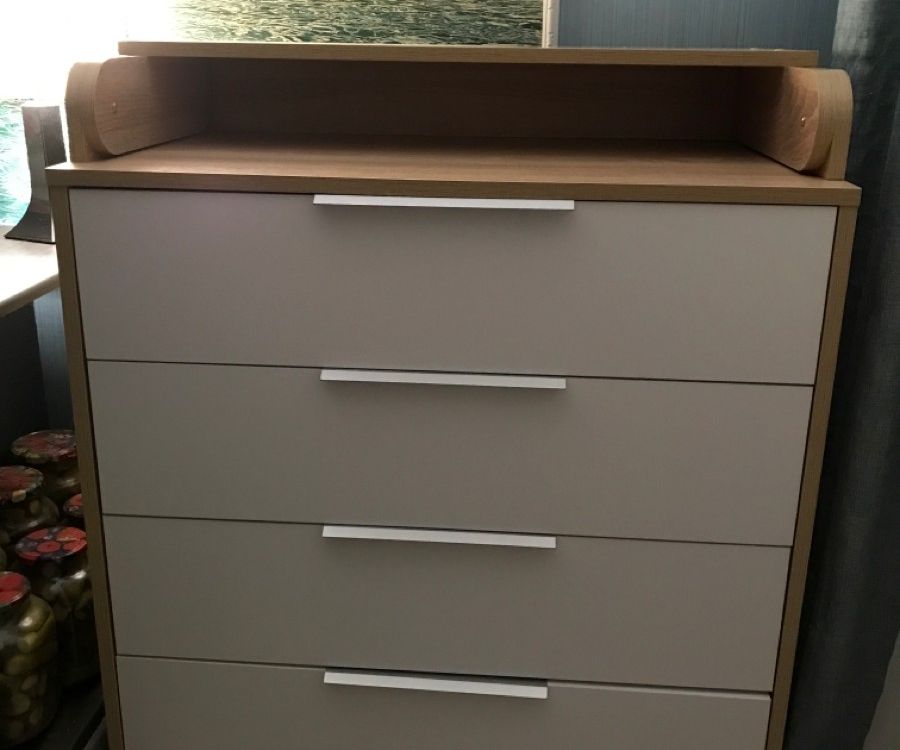Комод пришел быстро, все целое без значительный сколов. Не было креплений и комментариев по сборке верхней части комода. Докупали крепления ( так называемые уголки). Ну а в целом комод для своей цены очень приличный.