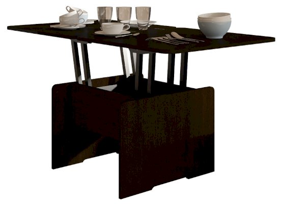 • Функциональность. Купив стол-трансформер потребитель получает сразу два изделия: небольшой журнальный столик и полноценный обеденный стол на 6–8 человек.