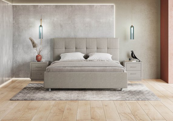 Лаконичная интерьерная кровать с изголовьем, украшенным декоративной строчкой. Модель изготовлена из ДСП. Обратная сторона изголовья обита темно-серым спандбондом, но, при желании, её можно выполнить из основного обивочного материала. В комплект кровати входит кроватное основание. Каркас основания выполнен из металла, ламели - из берёзы. При необходимости в комплект можно включить подъемный механизм с бельевым ящиком, который существенно увеличит объем хранения вещей,  а так же позволит легко производить уборку пыли под кроватью.