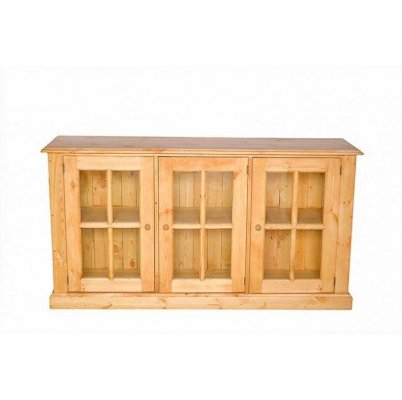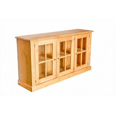 Витрина ELBA 3P. Широкая витрина-тумба с тремя остекленными дверцами и сплошной полкой. Такие низкие и удлиненные витрины предназначаются для того, чтобы выставлять на всеобщее обозрение коллекционные предметы или ценности, хотя и книжная коллекция будет смотреться в ней гармонично и естественно. Изделие полностью изготовлено из массива сосны.