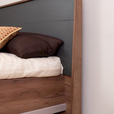 Эффектная двуспальная кровать коллекции КАРА с объемным сборным изголовьем в декоре Антрацит – элегантная модель, которая прекрасно впишется в любой интерьер и станет его визуальной доминантой. Декоративная накладная планка в цвете Велюр по периметру кровати подчеркивает фактурные теплые древесные полутона Дуба Табачного. Сборное изголовье в необычном обрамлении с декоративными «L»- ушками – ещё одна изюминка коллекции. Такое решение в сочетании с высокими ножками выглядит легко и гармонично.