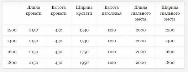 Кровать доступна в 4-х размерах: 1200, 1400, 1600 и 1800 мм.
