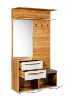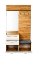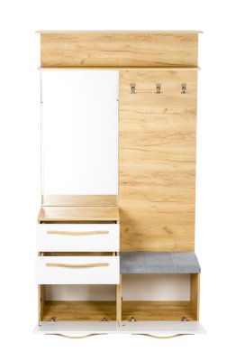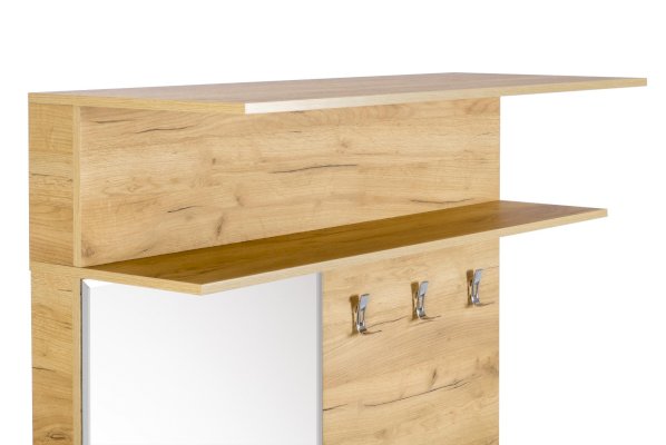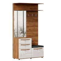 • Справа – 3 крючка. Внизу тумба с мягким сиденьем и ниша за откидной дверью на кронштейне