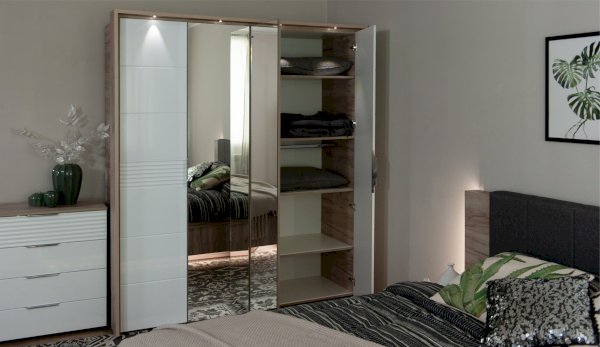 Современный распашной шкаф Джулия яркий представитель европейского минимализма. Это шкаф-конструктор, который позволяет выбрать подходящий вам размер, его наполнение и дизайн. На базе корпуса можно создать множество комбинаций: с зеркалами, с глухими глянцевыми фасадами, с порталом из ЛДСП 22мм или без него. Дополнительная опция – светодиодная подсветка монтируется в верхней части портала над каждой дверью. Шкаф выполнен из экологически безопасных надежных материалов. Декором белым глянцевым фасадам High Gloss служит фрезерованный рисунок «Волна» - подчеркивает зеркальный блеск, делает интерьер спальни особенным и неповторимым. Торцевые ручки из хромированного металла - яркий акцент фасадов. Наполнение шкафа включает в себя вместительные полки и отделения со штангой, что позволяет создать систему для хранения вещей различного назначения. Идеально компонуются со всеми модулями системы Джулия.