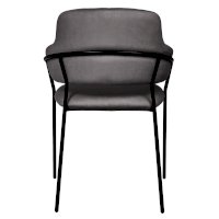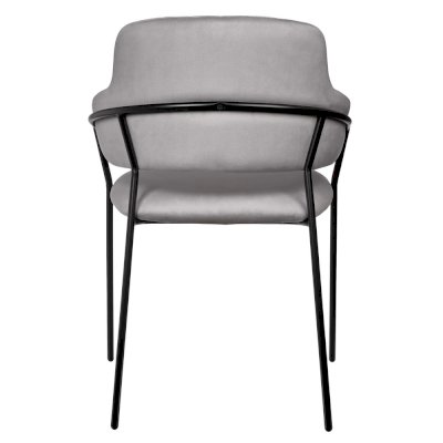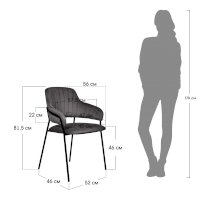 Каркас стула черного цвета изготовлен из прочного металла. Сидение обтянуто мебельным велюром, с приятной бархатистой структурой. Внутренняя сторона спинки украшена вертикальными строчками. Для комфорта есть высокие подлокотники.