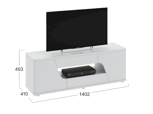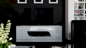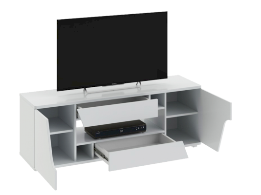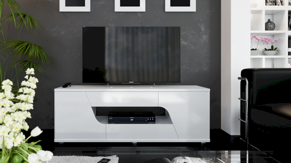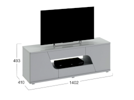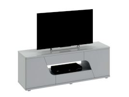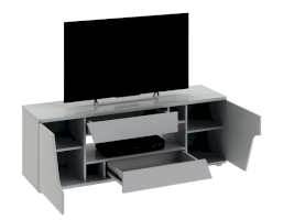 Тумба ТВ оснащена открытой нишей для техники, выдвижными ящиками, закрытыми секциями и широкой поверхностью подставки под телевизор. Отличительной чертой тумбы является отсутствие лицевой фурнитуры, что позволяет открывать ее с помощью захвата фасада рукой.