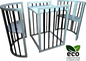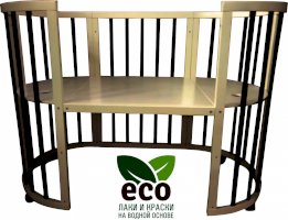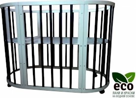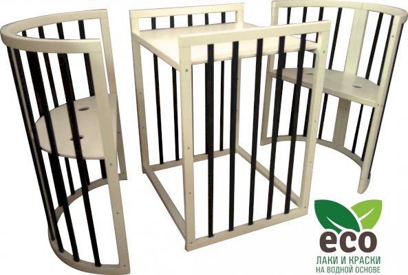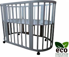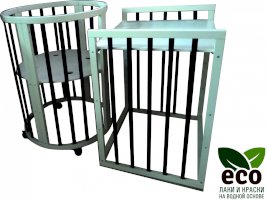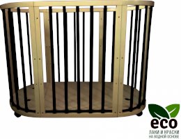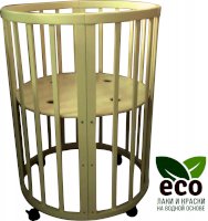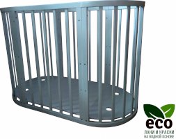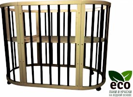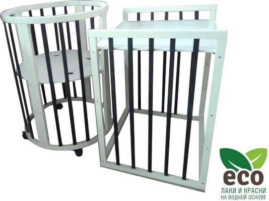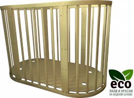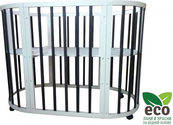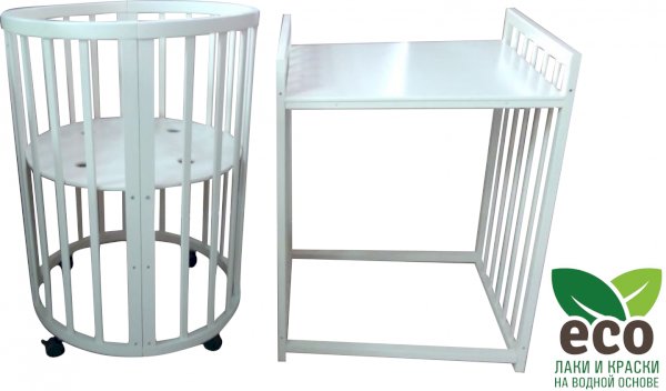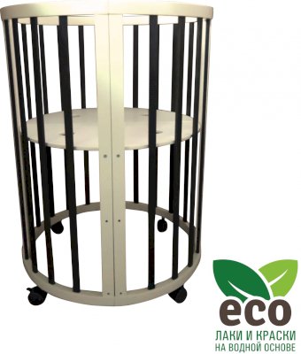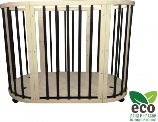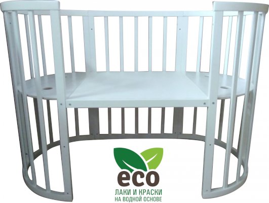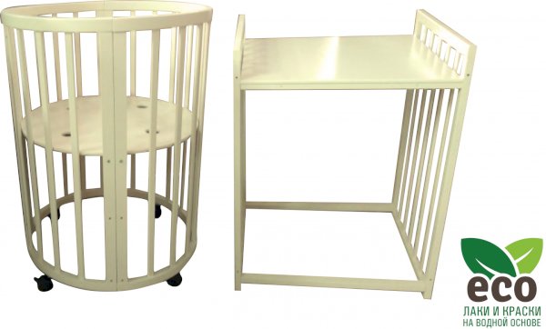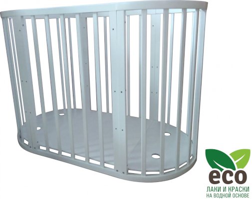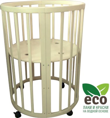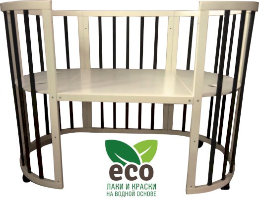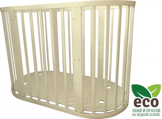 Выполнена из отборной бессучковой древесины березы без стыков, склеек и из высокопрочного МДФ. Привлекательный внешний вид достигается за счёт использования технологии скрытия стыков и метода тройной шлифовки. Покрыта нетоксичными лаками и красками на водной основе. В комплекте имеется 4 колёса с возможностью установки в различных положениях (для круглой и овальной кроватки).