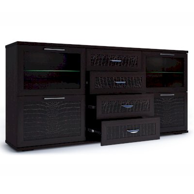 Комодино состоит из 3-х секций. Центральная комплектуется 4-мя ящиками на телескопических шариковых направляющих полного выдвижения с декором в центральных частях фасадов. Боковые секции делятся на две части. Верхние закрыты фасадами с тонированными стеклами, за которым располагаются стеклянные полки, а нижние — глухими с декоративными вставками из экокожи caiman темного цвета.